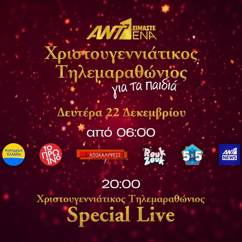 F Latest22/12/2025 13:04Είμαστε ένα: Σε εξέλιξη ο χριστουγεννιάτικος τηλεμαραθώνιος του ΑΝΤ1 για τα παιδιά - Το πρόγραμμα της ημέρας