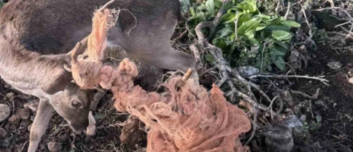 Το άτυχο ζώο εντοπίστηκε από το συνεργείο παγιδευμένο με τα κέρατά του μπλεγμένα σε σχοινιά, ενώ ήταν μούσκεμα από την βροχή, γεγονός που δείχνει ότι βρισκόταν εκεί για πολλές ώρες.