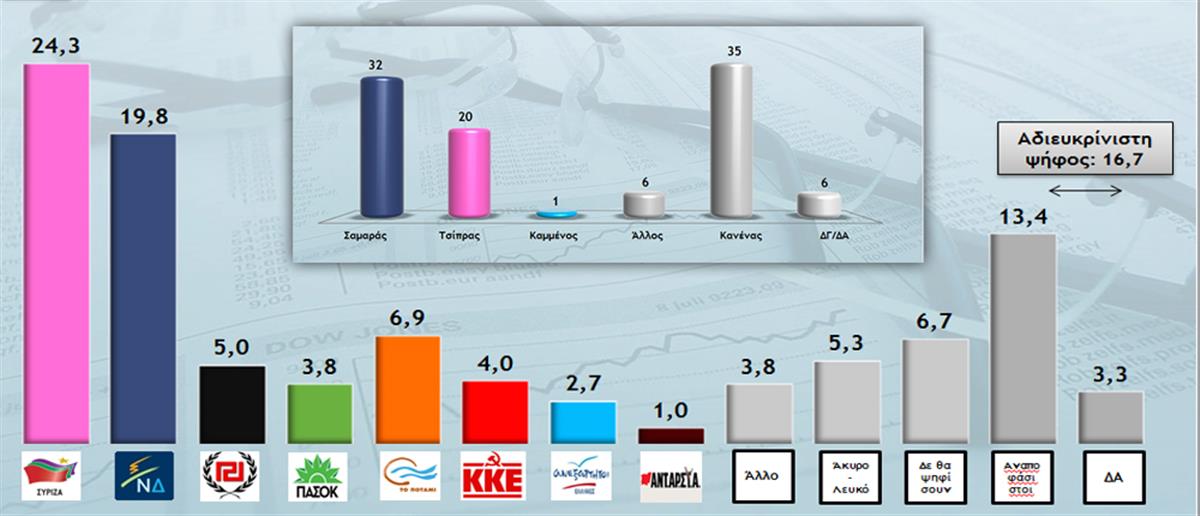 Σύμφωνα με την δημοσκόπηση, στην πρόθεση ψήφου ο ΣΥΡΙΖΑ προηγείται με 24,3% κι ακολουθεί με 19,8% η Νέα Δημοκρατία. Σταθερά στην τρίτη θέση είναι «Το Ποτάμι» του Σταύρου Θεοδωράκη με 6,9%.