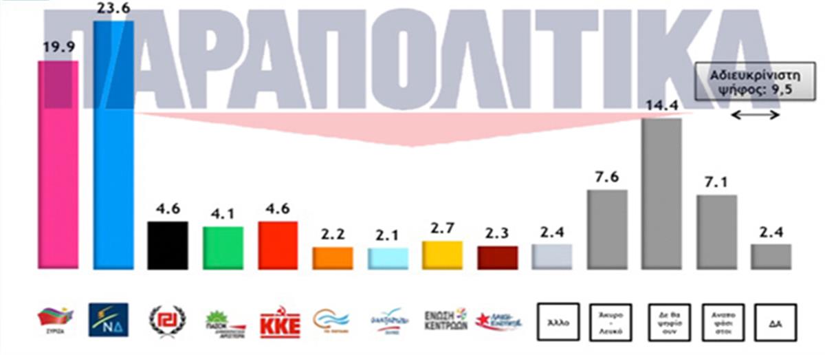 Αναλυτικά, η Νέα Δημοκρατία συγκεντρώνει ποσοστό 23,6% έναντι 19,9% του ΣΥΡΙΖΑ. Ακολουθούν, ΚΚΕ και Χρυσή Αυγή με το ίδιο ποσοστό 4,6% κι έπεται η Δημοκρατική Συμπαράταξη με 4,1%. Κάτω από το όριο του 3% κινούνται το Ποτάμι ( 2,2% ), Ανεξάρτητοι Έλληνες ( 2,1%), Ένωση Κεντρώων ( 2,7%) και Λαϊκή Ενότητα (2,3%). Άλλο κόμμα δηλώνει πως θα ψηφίσει το 2,4%, και Άκυρο/Λευκό το 7,6%. Αποχή από την κάλπη επιλέγει το 14,4% ενώ οι αναποφάσιστοι είναι σε ποσοστό 7,1%.