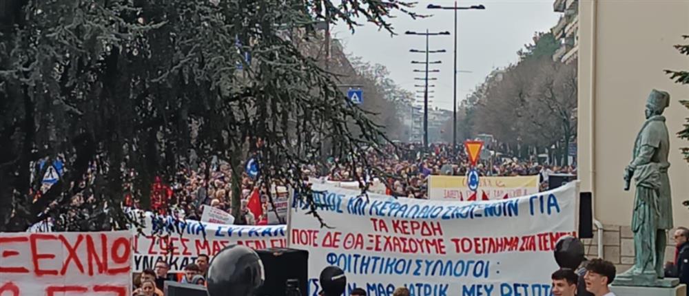 Δεκάδες χιλιάδες πολίτες διαδηλώνουν με ειρηνικό τρόπο, ενώνοντας τη φωνή τους με τους συγγενείς των θυμάτων και απαιτώντας απονομή δικαιοσύνης. Ο όγκος του πλήθους είναι τόσο μεγάλος, ώστε ο κόσμος «απλώνεται από το Πανεπιστήμιο Θεσσαλίας ως και τον ΟΣΕ.