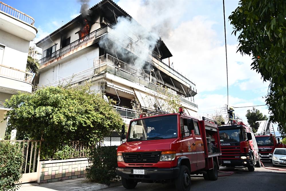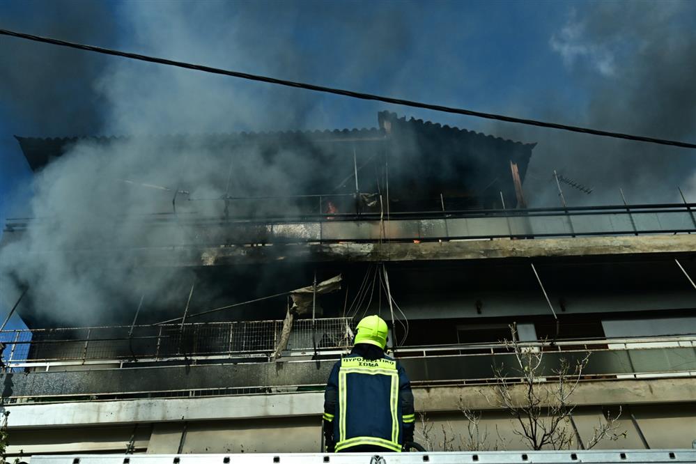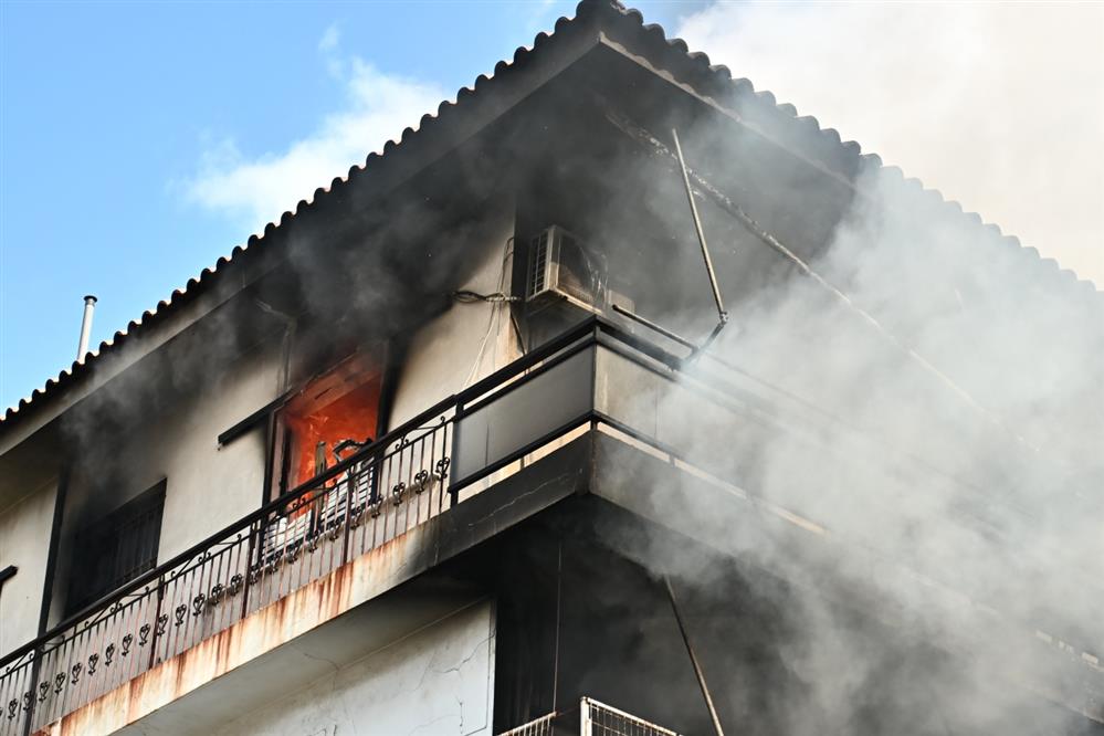 Λαμπάδιασαν δύο όροφοι, στην ταράτσα εγκλωβίστηκαν ένοικοι. Συναγερμός σήμανε στους πυροσβέστες που έσπευσαν και με βραχιονοφόρο όχημα.