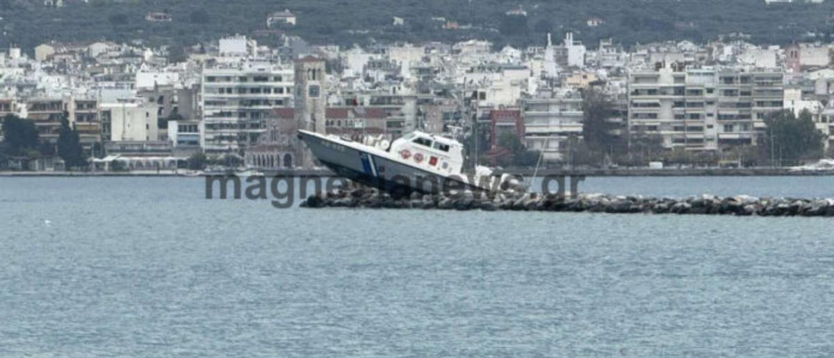 Συγκεκριμένα αντίκρυσαν ένα περιπολικό σκάφος του Λιμενικού Σώματος να έχει καβαλήσει τα βράχια στον λιμενοβραχίονα στην είσοδο του λιμένα Βόλου.