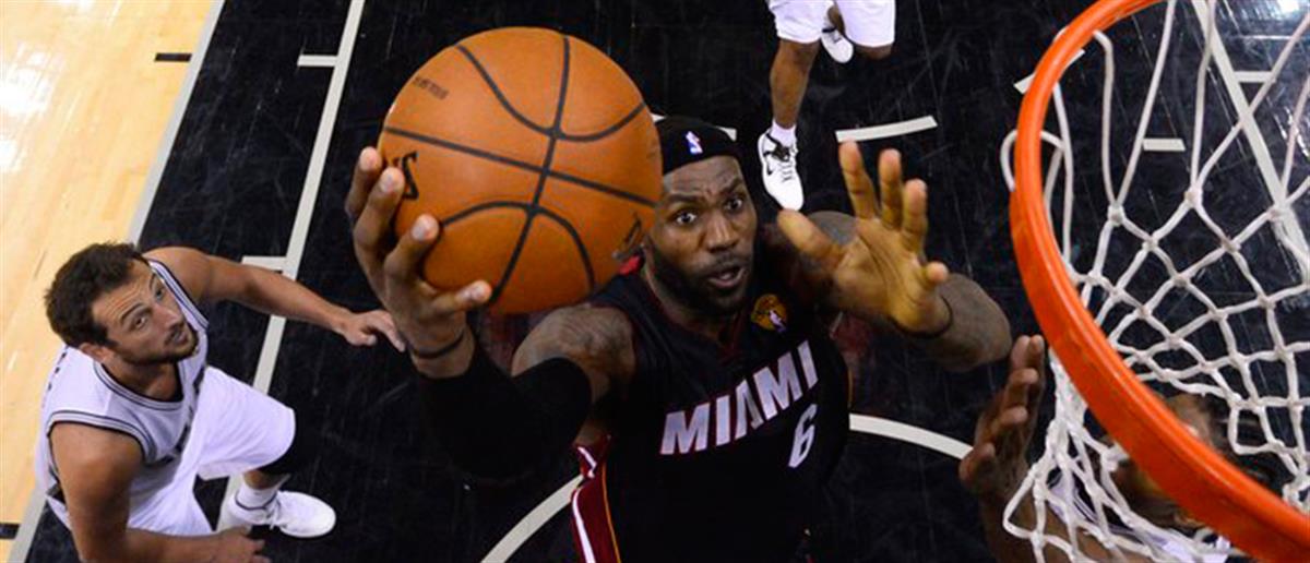Με μεγάλο πρωταγωνιστή για άλλη μια φορά τον ΛεΜπρον Τζέιμς, οι Μαϊάμι Χιτ επικράτησαν 98-96 των Σπερς στο Σαν Αντόνιο και ισοφάρισαν τη σειρά των τελικών σε 1-1. Ο σούπερ σταρ του Μαϊάμι με 35 πόντους, 11/19 δίποντα, 3/3 τρίποντα, 10 ριμπάουντ οδήγησε την ομάδα του στο break.