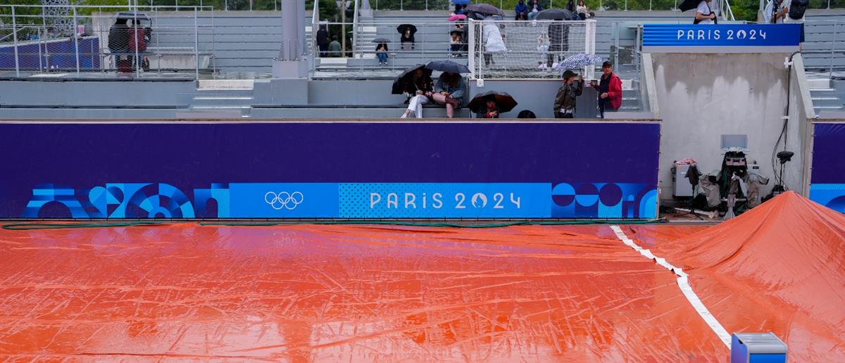 Η βροχή που πέφτει και σήμερα στο Παρίσι επηρέασε, όπως είναι φυσικό, και το τουρνουά τένις των Ολυμπιακών Αγώνων, το οποίο φιλοξενείται στις εγκαταστάσεις του Ρολάν Γκαρός. Οι αναμετρήσεις που ήταν προγραμματισμένες στα δύο κεντρικά κορτ («Φιλίπ Σατριέ» και «Σουζάν Λενγκλέν») διεξάγονται κανονικά, χάρη στην ύπαρξη στεγάστρου, αλλά στα υπόλοιπα γήπεδα οι αγώνες δεν έχουν καν αρχίσει. Κατόπιν αυτού, το παιχνίδι του Στέφανου Τσιτσιπά με τον Βέλγο Ζιζού Μπεργκς, που ήταν το τρίτο παιχνίδι του προγράμματος στο κορτ «Σιμόν Ματιέ» αναβλήθηκε και αναμένεται να επαναπρογραμματιστεί -καιρού επιτρέποντος- για αύριο.