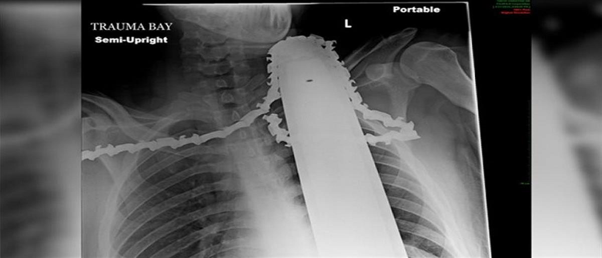 Ο 21χρονος James Valentine εργαζόταν ως ξυλοκόπος στο Πίτσμπουργκ. όταν συνέβη το ατύχημα… Η λάμα από το αλυσοπρίονο που κρατούσε και δούλευε του καρφώθηκε κυριολεκτικά στο λαιμό.