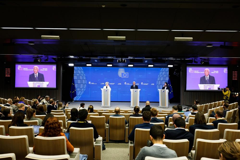Ο πρόεδρος του Ευρωπαϊκού Συμβουλίου Αντόνιο Κόστα μίλησε κατά τη συνέντευξη Τύπου που ακολούθησε το τέλος της έκτακτης συνόδου κορυφής για «καθοριστική στιγμή για την Ευρώπη, για την ασφάλεια των Ευρωπαίων».