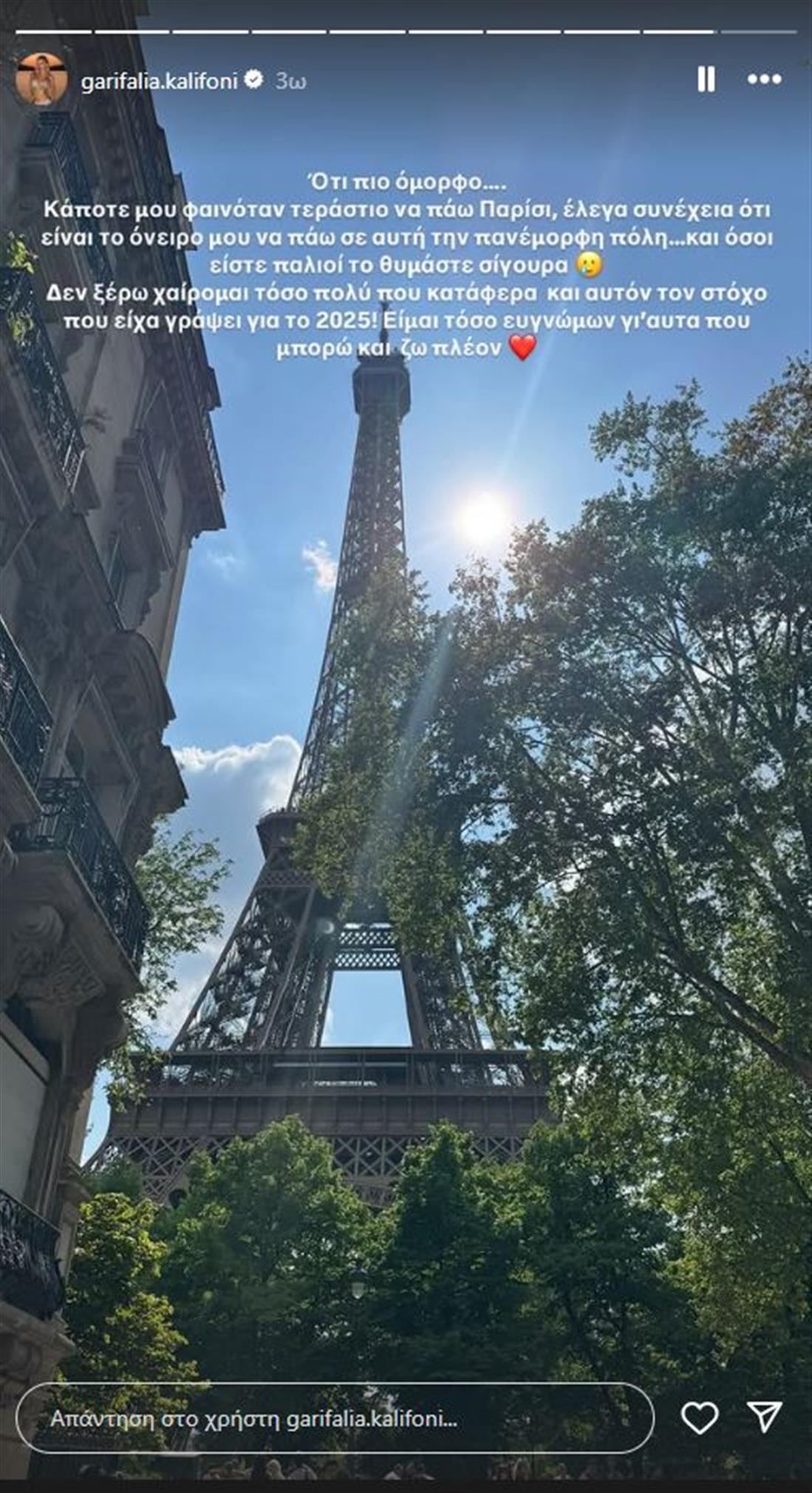 Η Γαρυφαλλιά Καληφώνη με τη δική της σειρά σημείωσε στην ανάρτησή της: “Ό,τι πιο όμορφο… Κάποτε μου φαίνονταν τεράστιο να πάω στο Παρίσι, έλεγα συνέχεια ότι είναι το όνειρό μου να πάω σε αυτή την πανέμορφη πόλη και όσοι είστε παλιοί θα το θυμάστε σίγουρα. Δεν ξέρω, χαίρομαι τόσο πολύ που κατάφερα και αυτόν τον στόχο που είχα γράψει για το 2025. Είμαι τόσο ευγνώμων γι’ αυτά που μπορώ να ζω πλέον”.