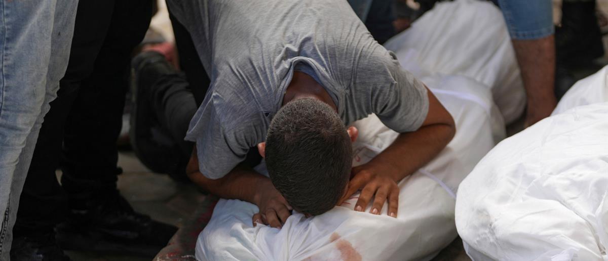 Στο νοσοκομείο Μαρτύρων του αλ Άκσα στη Ντέιρ αλ Μπάλα Παλαιστίνιοι κλαίνε μπροστά στα πτώματα πέντε ανθρώπων που σκοτώθηκαν στη Νουσεϊράτ, τα οποία είναι καλυμμένα με ματωμένες κουβέρτες.