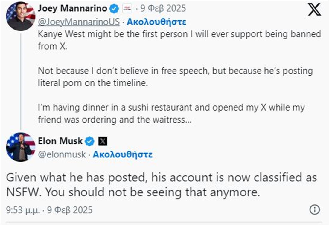 "Δεδομένων των αναρτήσεων, ο λογαριασμός του εντάχθηκε στην κατηγορία NSFW. Δεν θα μπορείτε πλέον να τον δείτε", έγραψε ο Έλον Μασκ σε ανάρτηση – ανακοίνωσή για το ban του Κάνιε Γουέστ.