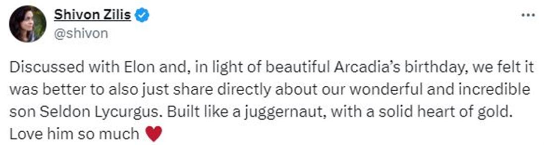 «Συζητήσαμε με τον Έλον και με αφορμή τα γενέθλια της όμορφης Αρκέντια, θεωρήσαμε ότι ήταν καλό να κοινοποιήσουμε τα νέα για τον υπέροχο και απίστευτο γιο μας, Σέλντον Λικούργκους», έγραψε η Ζίλις σε ανάρτησή της στην πλατφόρμα Χ (πρώην Twitter). Δεν διευκρίνισε πότε γεννήθηκε το παιδί.