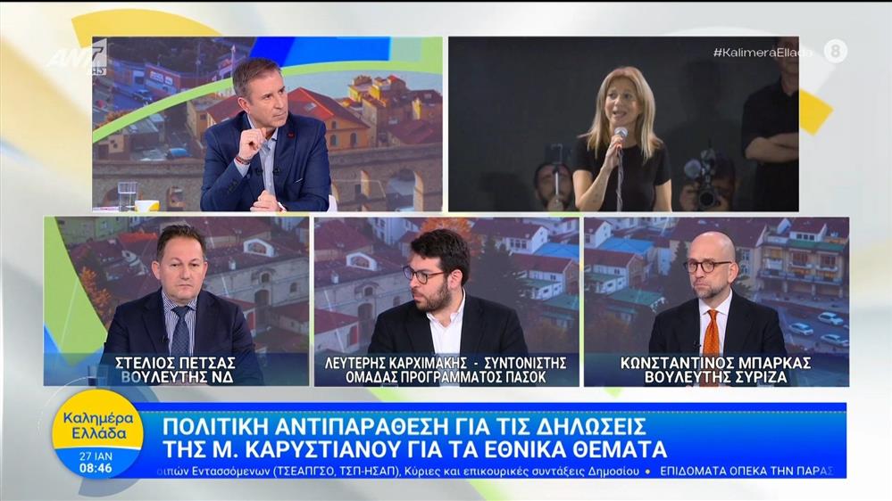 Πολιτική αντιπαράθεση για της δηλώσεις της Μ. Καρυστιανού για τα εθνικά θέματα – Καλημέρα Ελλάδα – 27/01/2026Οι Στ. Πέτσας, Λ. Καρχιμάκης και Κ. Μπάρκας στο Καλημέρα Ελλάδα.