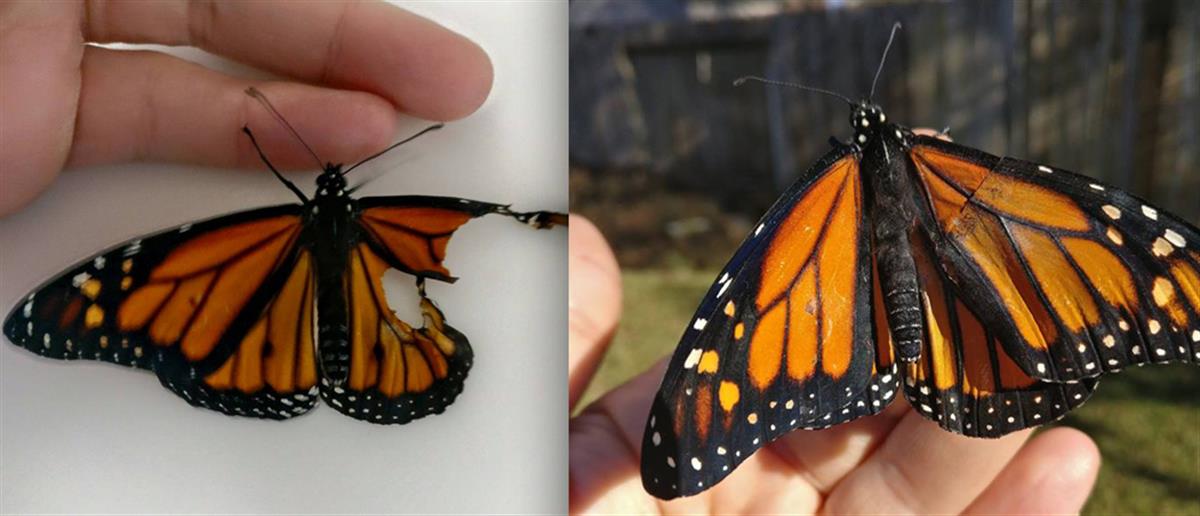 Το είδος αυτής της πεταλούδας, η μονάρχης, ζει για πολλούς μήνες και δεν έχει νεύρα στα φτερά της, κάτι που έκανε την 43χρονη να μην φοβάται μήπως την τραυματίσει. Έτσι, κατάφερε να της κάνει την μεταμόσχευση φτερού και αφού το κόλλησε έβαλε την πούδρα, ώστε να μην κολλήσει με το άλλο φτερό ή το σώμα της πεταλούδας.